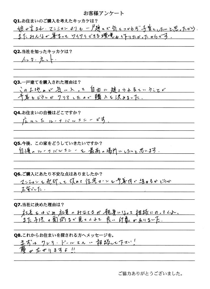 娘が生まれ、マンションよりも一戸建てで気をつかわず子育てにしたいと思ったから、またみんなが集まってワイワイできる環境も作りたかったからです。
