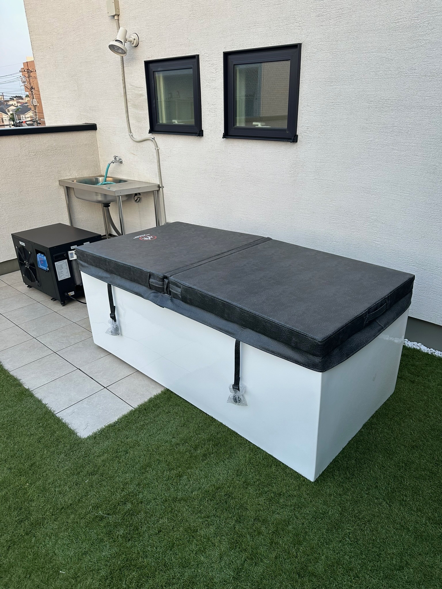 アクリルコールドプランジ。ワイド1.5mから1.7mをご用意。軽量で室内外置くことが出来ます。バスタブ裏面に吹き付け断熱をしているため保冷効果も抜群。シンプルにホワイトとブラックをご用意しております。