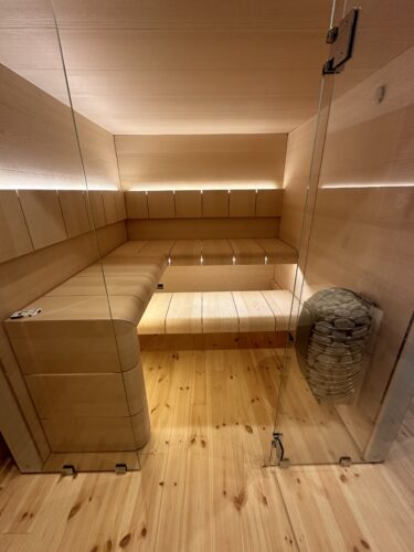 美しく明るい色合いと穏やかなライン中で、サウナの熱につつまれる。