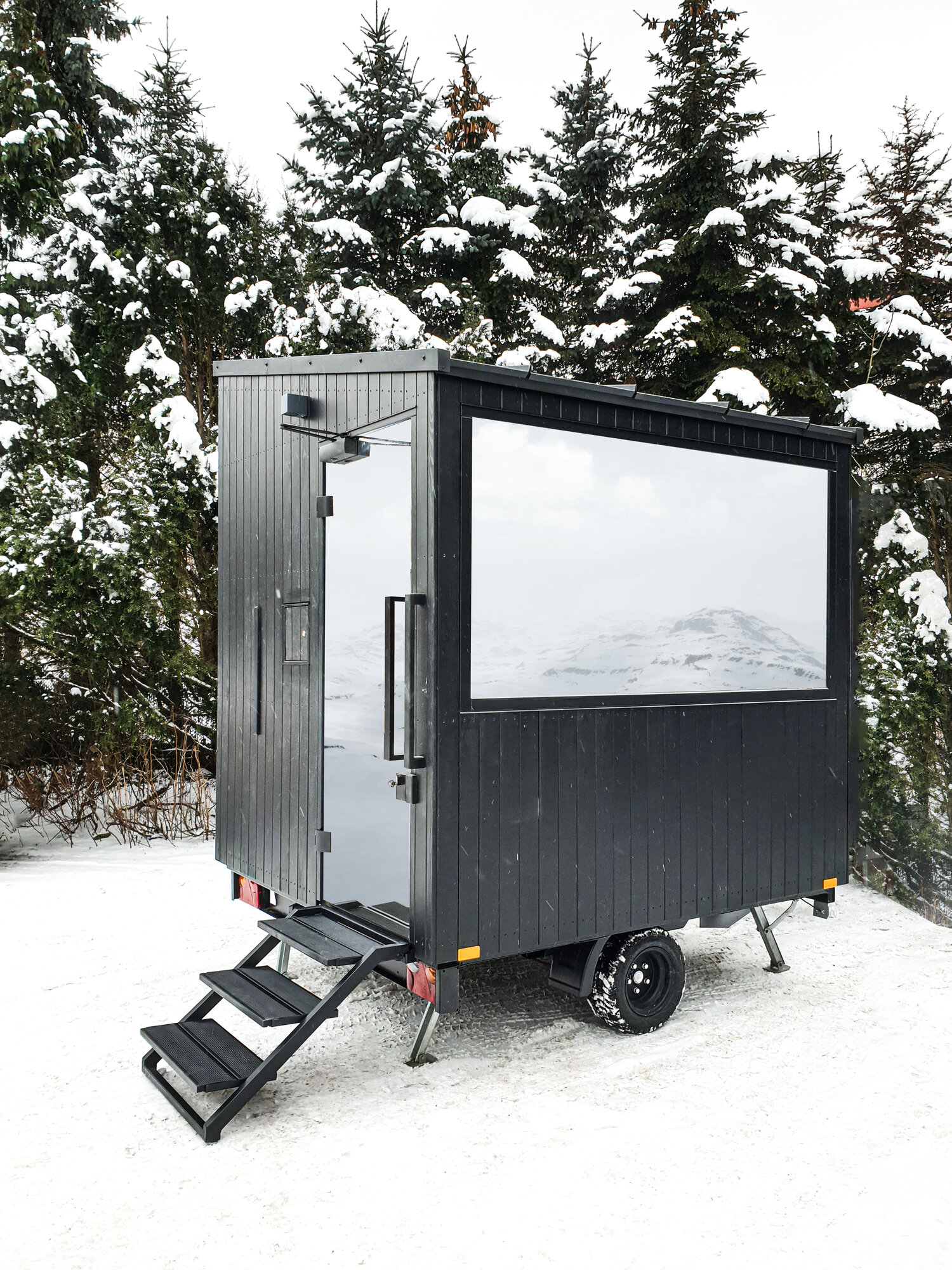 サウナと一緒に旅ができる移動式のサウナキャビンはハルビアのストーブを搭載しています。