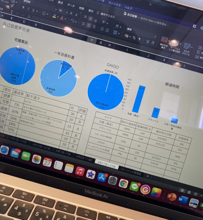 大学で学んだエクセルなどを使って、やった時間や成果を数値化して目に見えるようにしました!