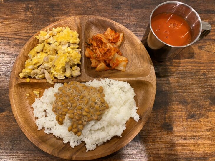 ↑親子丼の汁どこかいってしまったものとキムチ、納豆ご飯、野菜ジュースです(笑)