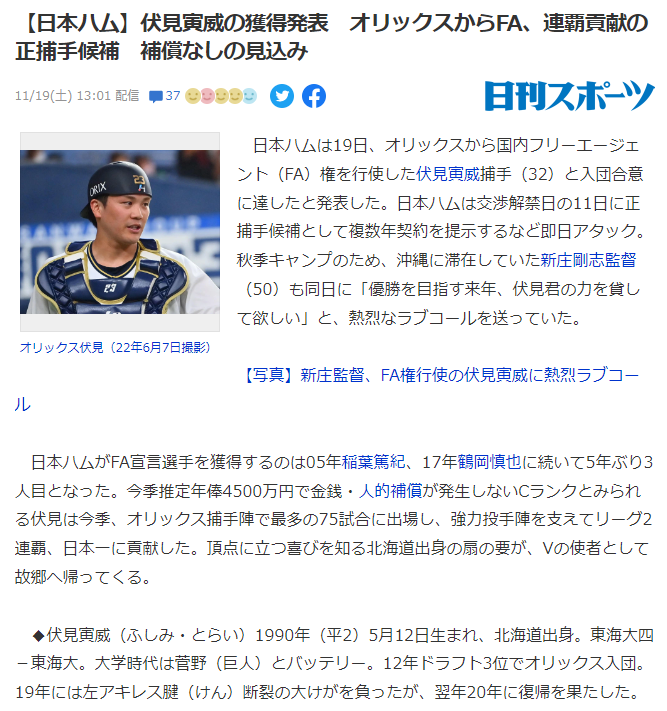 川口の最推し伏見選手がFAで日本ハムに行ってしまいました…